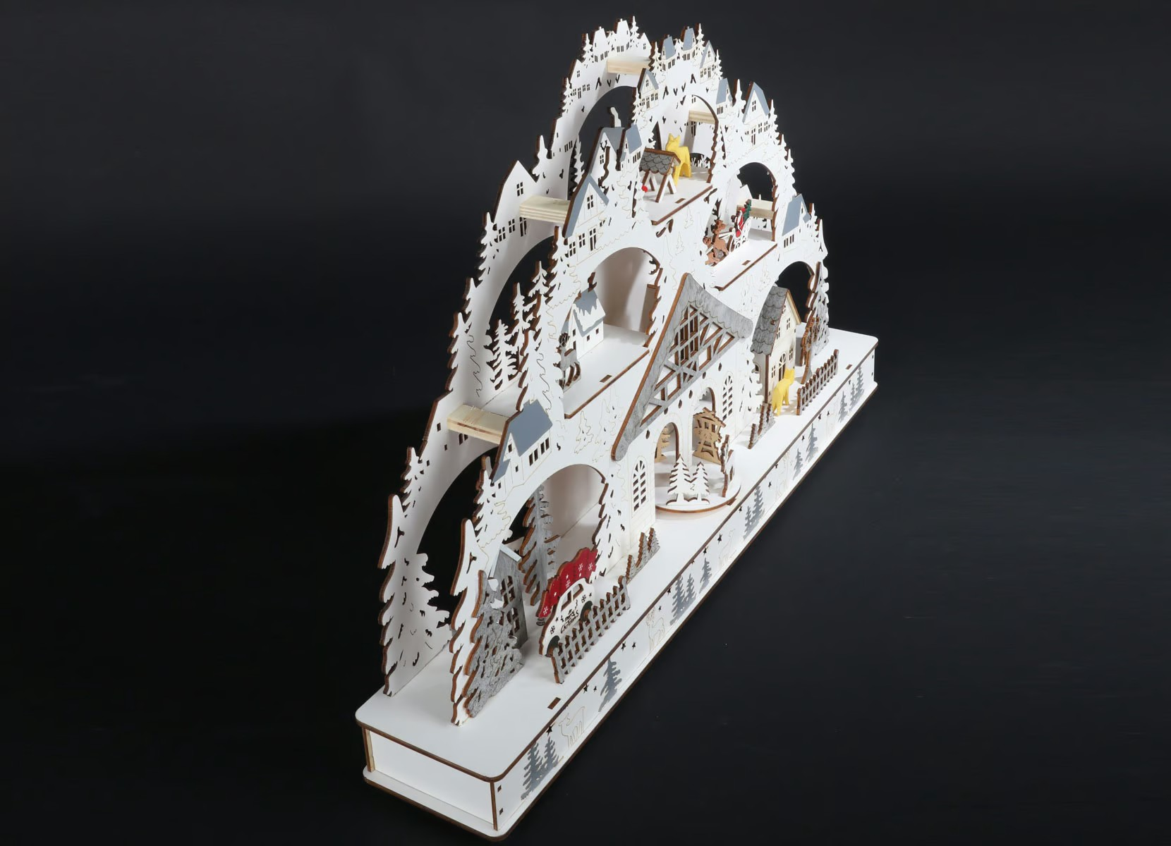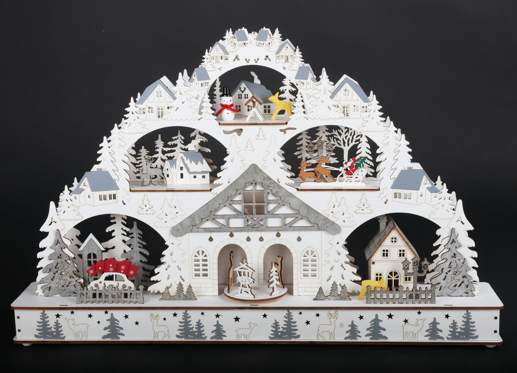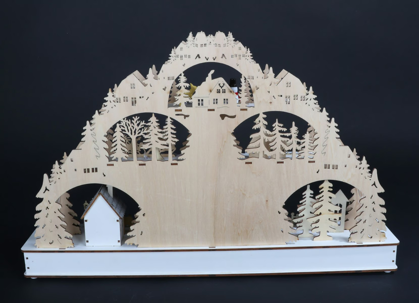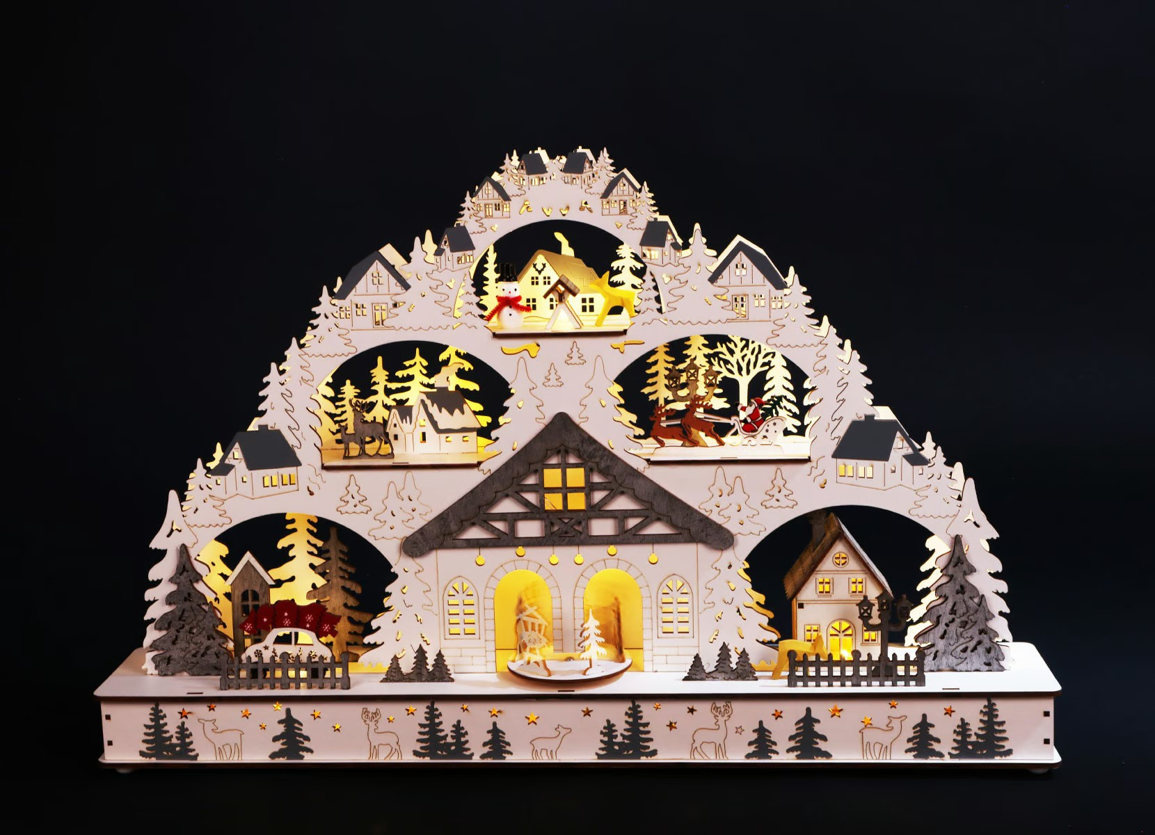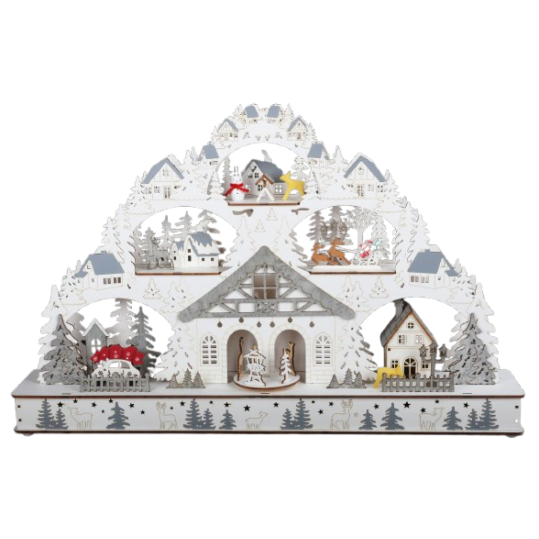 Atraskite stebuklingą atmosferą, kurią į namus atneš su meile sukurta medinė LED šviesos arka. Arka yra su subtiliomis ir detaliomis žiemos scenomis. Šiltai balti šviesos diodai sukuria jaukią ir šventišką atmosferą bet kuriame kambaryje. Šviesos arkos centre rasite apvalią platformą su žaviomis figūrėlėmis, kurios linksmai sukasi ir skleidžia prieššventinę nuotaiką. Vienu mygtuko paspaudimu galite įjungti įvairias šventines melodijas, kad šventinio laikotarpio garsai persikeltų į namus. Praktiškų maždaug 60 x 10 x 40 cm. matmenų šviesos arka harmoningai įsilieja į bet kokią aplinką ir tampa šventiniu akcentu.